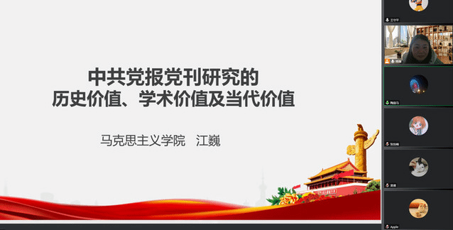 44118太阳成城集团江巍博士以“中共党报党刊研究的历史价值、学术价值及当代价值”为题,通过线上方式作学术讲座。她以中共党报党刊发展的百年历程为切入点,系统梳理了建党至土地革命时期、抗日战争至解放战争时期、新中国成立至新时代党报党刊的发展演进情况,总结了当前党报党刊的研究现状及存在问题。江巍博士表示,党报党刊是党的喉舌,与党的成长壮大关系密切,一方面有其历史价值,是一笔宝贵的历史财富,是我们了解和学习中共党史的生动素材;另一方面有其学术价值,有利于充实中国近代报刊史、新闻史和文化史的研究,深化中共党史、新中国史、改革开放史和社会主义发展史的研究并提供丰富材料,进一步丰富马克思主义理论、中共党史党建等一级学科研究的视角和领域。整场讲座思路清晰、内容丰富、深入浅出,与会教师一致表示受益匪浅。