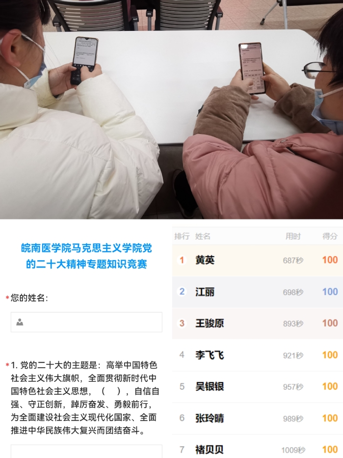 竞赛围绕党的二十大精神、党章、党规党纪等知识,采取线上答题的方式。参赛教工聚精会神、争分夺秒,最终根据得分和用时,决出前五名。