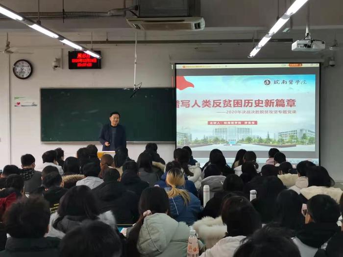 廖圣宝围绕“谱写人类反贫困历史新篇章”主题,认真梳理新中国成立以来中国共产党扶贫脱贫事业的演进历程,以生动事例、丰富内容和详实数据,全面展示脱贫攻坚巨大成就,重点讲授了党的十八大以来,以习近平同志为核心的党中央从全面建成小康社会大局出发,实施精准扶贫精准脱贫方略,全面打赢脱贫攻坚战,引导员工充分认识中国特色社会主义制度的优越性,勉励同学们厚植家国情怀,自觉听党话跟党走,把“爱国情,强国志,报国行”融入到实现中华民族伟大复兴中国梦的奋斗之中,乘势而上,凝心聚力,以青春之我、奋斗之我,为祖国建设添砖加瓦。整个授课过程把知识传授和价值引领相统一,既注重启发思考,更强化价值引领,春风化雨地给员工以理论滋养和精神力量,教育引导老员工进一步增强“四个意识”、坚定“四个自信”、做到“两个维护”。