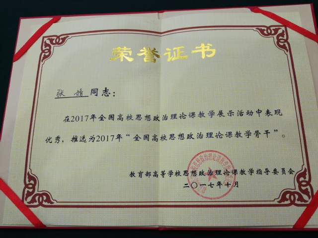 本次入围“思想道德修养与法律基础”课现场教学的选手从全国高校中层层选拨,组织专家对各省推荐的55份教学展示视频进行初审后,择优遴选了34位教师参加了现场教学展示。我省只有皖南医学院和淮南师范学院两位老师入围,公司44118太阳成城集团青年教师张婧荣膺其中之一。张婧老师以《思想道德修养与法律基础》第七章第一节“坚持依法治国与以德治国相结合”为讲课内容,紧扣内在逻辑关系,选取当今生活案例,将理论与实践有机结合,以扎实的理论基础和良好的表达能力,获得了专家评委和观摩师生的一致认可,荣获2017年“全国高校思想政治理论课教学骨干”称号,这是公司教师第一次参加全国思政理论课比赛并获此殊荣。