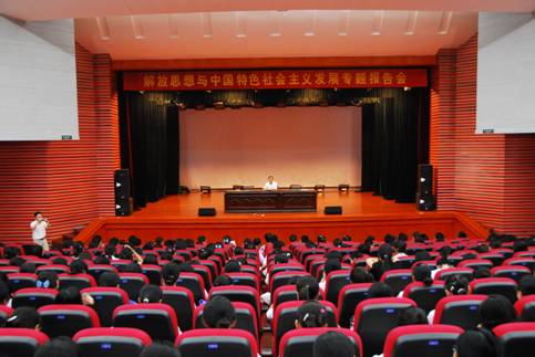 汪青松教授在报告会上,从解放思想与中国改革开放30的历程,如何进一步解放思想这两个大的方面展开论述。汪教授旁征博引、谈古论今,从“解放思想是发展中国特色社会主义的一大法宝”和“改革开放30年,就是解放思想的30年”详细地阐释了解放思想与中国特色社会主义发展的关系,并对新时期如何继续解放思想、解放思想的“六项”内容进行了精辟论述。汪教授幽默风趣,报告厅里不时地爆发出一阵阵的笑声和掌声。汪教授精彩的报告使广大同学在轻松愉快的氛围中加深了对解放思想与中国发展特色社会主义的理解,以及如何在学习和工作中解放思想有了深刻认识。