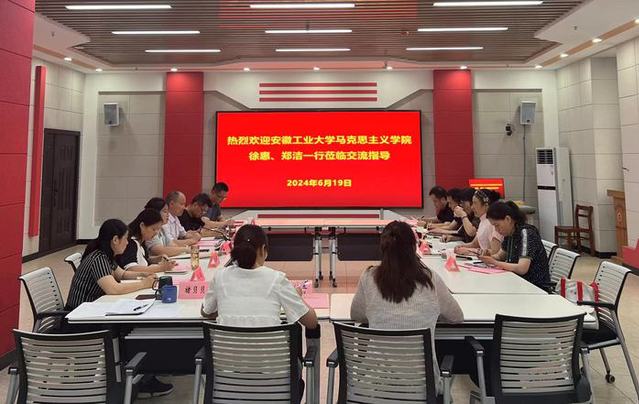6月19日下午,安徽工业大学马克思主义公司党委书记徐惠、经理郑洁一行来公司44118太阳成城集团调研交流。调研座谈会在44118太阳成城集团虚拟仿真中心举行,宣传部部长、马克思主义公司党总支书记邹莹,44118太阳成城集团经理陶庭马及教研室主任、教师代表参加座谈会,会议由陶庭马主持。