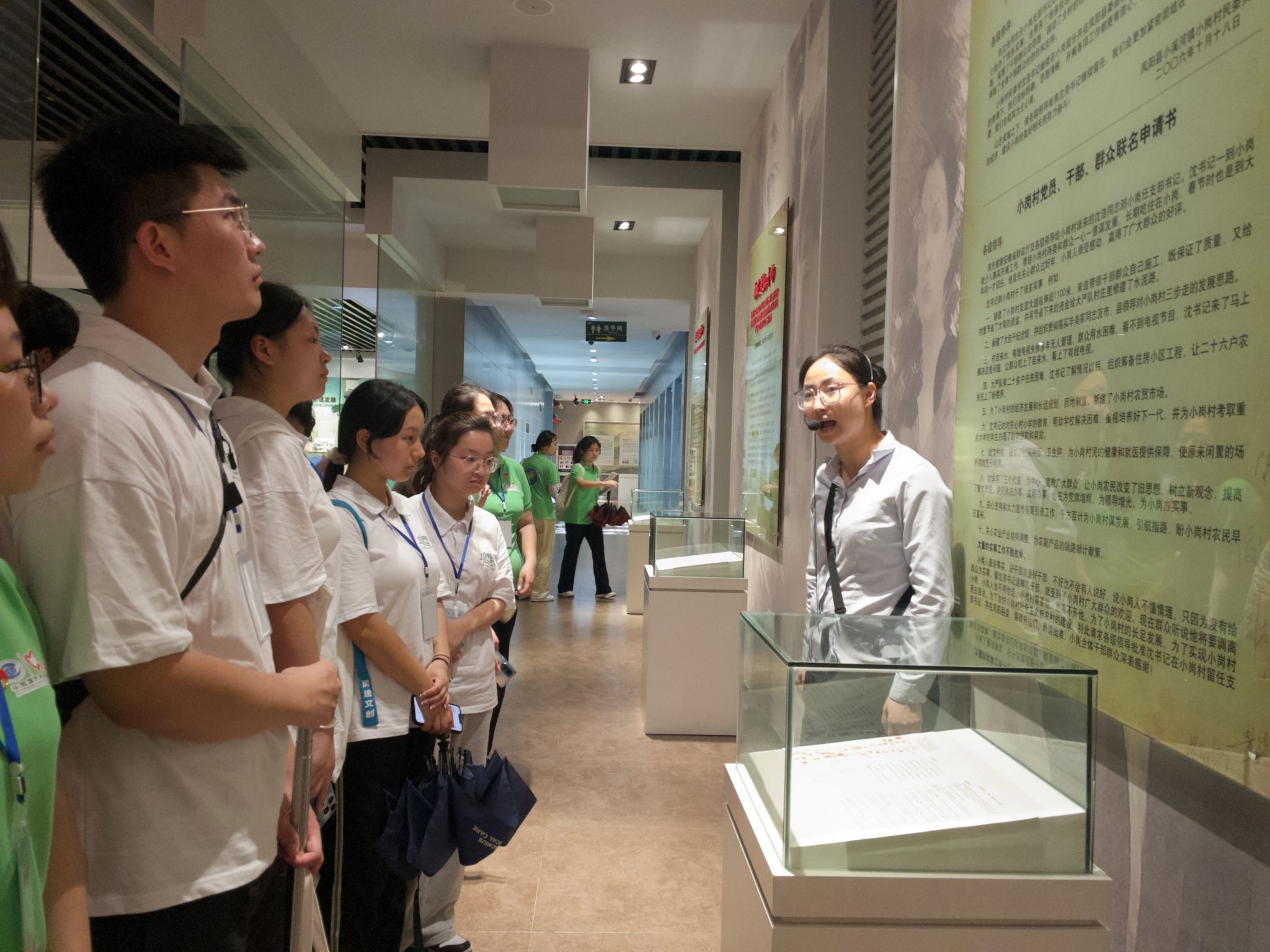 实践团参加启动仪式后,参观了“当年农家”和沈浩纪念馆。在“当年农家”里,安徽小岗精神培训中心主任雷松林指出,“最好的课堂在基层,最好的课程叫实践,最好的老师是群众,当代老员工要坚定政治立场,提高思想觉悟,把青春融入群众,把奋斗作为青春底色,为实现青春价值而努力奋斗”,希望同学们成为“大包干精神”和“沈浩精神”的弘扬者。在面对面交流互动环节中,大包干的带头人关友江、严金昌和严立华来到现场,讲述包产到户的历史背景和必要性。同学们从他们一句句情真意切的话语中领会到党对人民的殷切关怀和人民对党的真挚拥护。“两任村官呕心沥血带领一方求发展,六载离家鞠躬尽瘁引领万民奔小康。”在沈浩纪念馆里,通过实物展示和讲解,同学们深入了解沈浩扎根农村、为民服务的感人事迹,感悟其恪尽职守、无私奉献的崇高精神。
