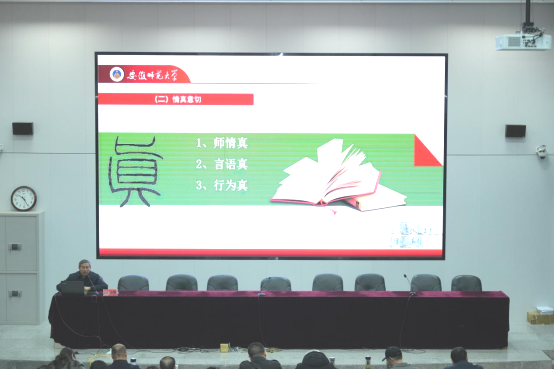 研修活动第一阶段,安徽师范大学44118太阳成城集团教授、博士生导师路丙辉教授以“为师四心”为题作专题讲座,强调思政课教师需以真心、爱心、耐心、平常心为指引,照亮员工前行的方向。第二阶段,由来自宣城市第二小学、安吉县外国语学校、广德中学和皖南医学院的五位教师围绕“创新领航,共创未来”这一主题进行教学展示。五节跨学段的课例,如同一幅渐次展开的育人画卷,让与会教师看到从小学启蒙到大学深化的全链条思政课堂,感受不同学段如何立足员工成长规律,实现育人目标的阶梯式递进。最后,安吉教育科学研究中心和广德中学思政教育名师结合育人实践分享对一体化建设的思考与展望。