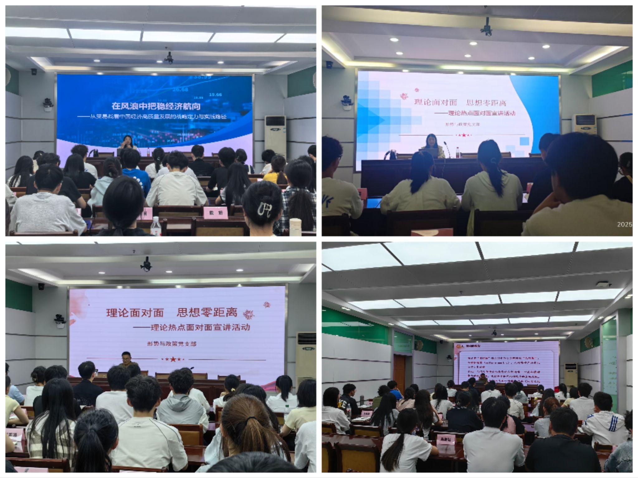党支部书记江巍作“在风浪中把稳经济航向——从贸易战看中国经济高质量发展的战略定力与实践路径”主题报告,客观分析了中美贸易战的背景、实质,深入阐释了新时代我国经济发展的制度优势与转型路径;党支部副书记王守平以“坚定文化自信 建设社会主义文化强国”为题,深入解读了习近平文化思想的主要特质和实践要求。宣讲活动主题鲜明、逻辑严谨、讲授生动,活动中师生情绪饱满、交流互动氛围热烈。