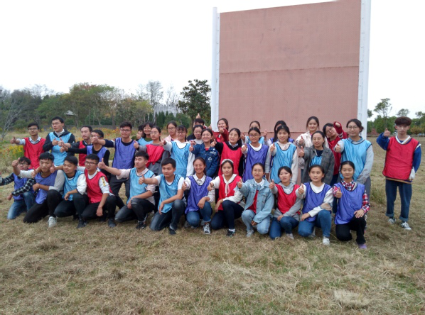 此次拓展训练在专业老师带领下完成的,活动分为三个部分。第一部分是分组建立团队,规定在十分钟之内完成特色鲜明、鼓舞士气的队名、队徽、队歌,并推举一名队长。由于30多名同学来自不同学院,彼此之间较为陌生,组建团队之前拓展老师带领同学展开多个实训环节,帮助同学快速熟悉并建立基本的信任,使同学们迅速进入角色,在轻松有趣的氛围里熟识起来,并尽快完成团队组建工作。