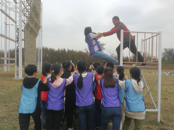 最后一个环节是攀爬毕业墙,让队员懂得个人目标与团队目标的关系,只有团队获得胜利才是真正的胜利。毕业墙,又称逃生墙、胜利墙、海难逃生,据说是二战时期,集中营里的犯人为获得自由而集体合作翻越4.2米的狱墙。全体队员用最短的时间翻越一面高达4.2米的光滑墙面,且不能借助任何外界的工具,能用的资源只有每个人的身体。拓展老师宣布此任务时,同学们一开始都觉得不可思议,认为这是一项不可完成的任务。可是等确定规则并立即要求立即执行时,所有同学不再犹豫,立即分工,搭建人墙,以自己的肩膀为攀爬的同学提供梯子。最终全部完成了挑战。
